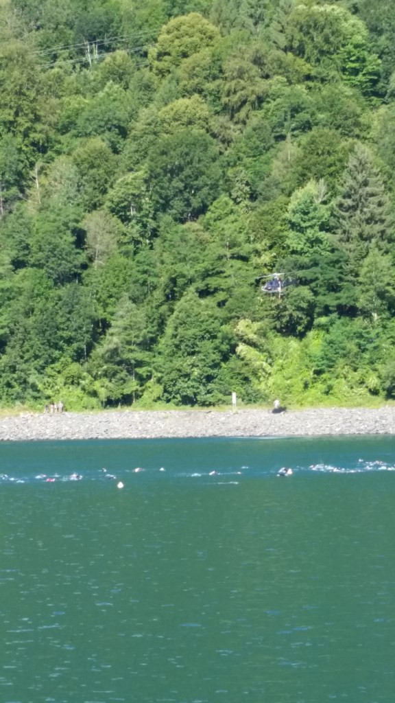 I had planned to do a 10-15 min warm up; however by the time everyone had filed into the water down the prepared carpeted entry it was less than 5 mins until the start.  I only just about had time to swim swimto the back of the field before the gun went!  This was my second mass swim start.  I now really understand what ‘the washing machine’ effect is.  It took me most of the first lap to calm down and get into something of a rhythm.  I got very tight on the first turn and regretted it as everyone piled over me.  The second lap was much more relaxed, with more space, and I enjoyed the fact I was swimming in a stunning location in clear fresh water with the sun shining.  The swim exit was fine with a marshal there to steady me and give me a shove up the steep exit.  Swim complete in about 44 mins, not fast, but I survived. My garmin suggests it was more like 2.5 km.  Placed 408 overall – so middle (ish) of the pack.  Said hello to my friend in transition, just slightly ahead of me in getting out on to the bike.