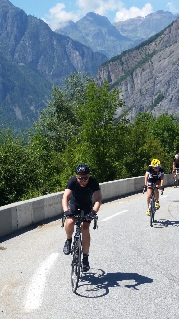 The first 26 km was a fast, false flat downhill and felt really easy.  It was tricky to avoid getting too close to other competitors but I did my best to avoid drafting.  I quickly caught up with my friend who said he had already seen the officials handing out a 5 min penalty for drafting. Noted.  The climb up the Alpe du Grand Serre was from 26 km to 40 km.  I was very conscious not to expend too much energy on the first climb and tried to keep my heart rate under control.  A quick stop at the summit to top off my water and I was on my way.  I really enjoyed the next section and picked up a lot of places on the decent which took us to just beyond Valbonnais at around 70 km (time check 3hrs 42).  It was starting to heat up now, but the fast pace and stunning  views on the decent were a good distraction.  I was careful to take on plenty food, taking a gel every 30 mins, supplemented by some savoury stuff at the feed stop in Valbonnais.  From Valbonnais we eased into the Cat 2 Col du Ornon.  The climb was long at 22 km, but didn’t really register as a proper climb in terms of gradient until the last 3 or 4 km.  The whole climb was south facing and very hot.  The decent down to the foot of Alpe d’huez was another corker – 15 km screaming down alpine roads at 70+ kph – brilliant fun!  I do have a vague recollection of the organisers saying that it was a pretty technical decent.  I ignored that and around 5 km into the decent I overcooked it on a corner, locking up my back wheel and sliding across the road.  Thankfully I slowed down enough not to go beyond the barrier.  Lesson learned – I took it a bit easier from that point on and started to think about Alpe d’Huez.