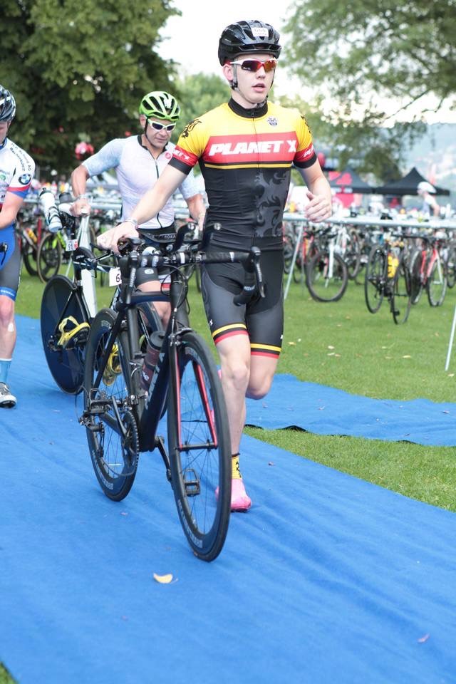 The calm nervous silence was broken with the sound of the start gun and we were moving towards the lake. I got myself to the edge so I could swim out alongside people rather than in the middle and swim my own race, this helped a lot, I wasn’t getting the draft triathletes always talked about but I was happy, calm and relaxed doing my own thing to the side of the pack. I wasn’t using energy panicking or fighting for my space on someone else’s legs. Then THUMP. I swam head first straight into a kayaker who was there to stop us swimming too far out of line. I’d rather crash on the swim than the cycle so this didn’t bother me too much. I looked up towards the next sighting buoy and the best way to describe what I saw was as if you’re in a bathroom with a mirror in front and behind you, there’s an endless line of shampoo bottles. This is exactly what I saw- well not shampoo bottles- but orange buoys. As I came to the end of the swim the booming of the music and shouting from the crowd got louder and I got more excited, up the ramp and ran into transition. I got changed into my cycle gear and set down to eat some food for 2 minutes, I was in no rush but the same couldn’t be said for everyone else in the transition tent. With a swim time of 1:00:43 only 5 minutes behind the fastest pro and faster than a handful of them meant I was surrounded by the best of the best, these guys where racing for a slot at Kona (the world championships), and sure didn’t look like they had time to sit down and join me for a bread roll and pack of raisins.