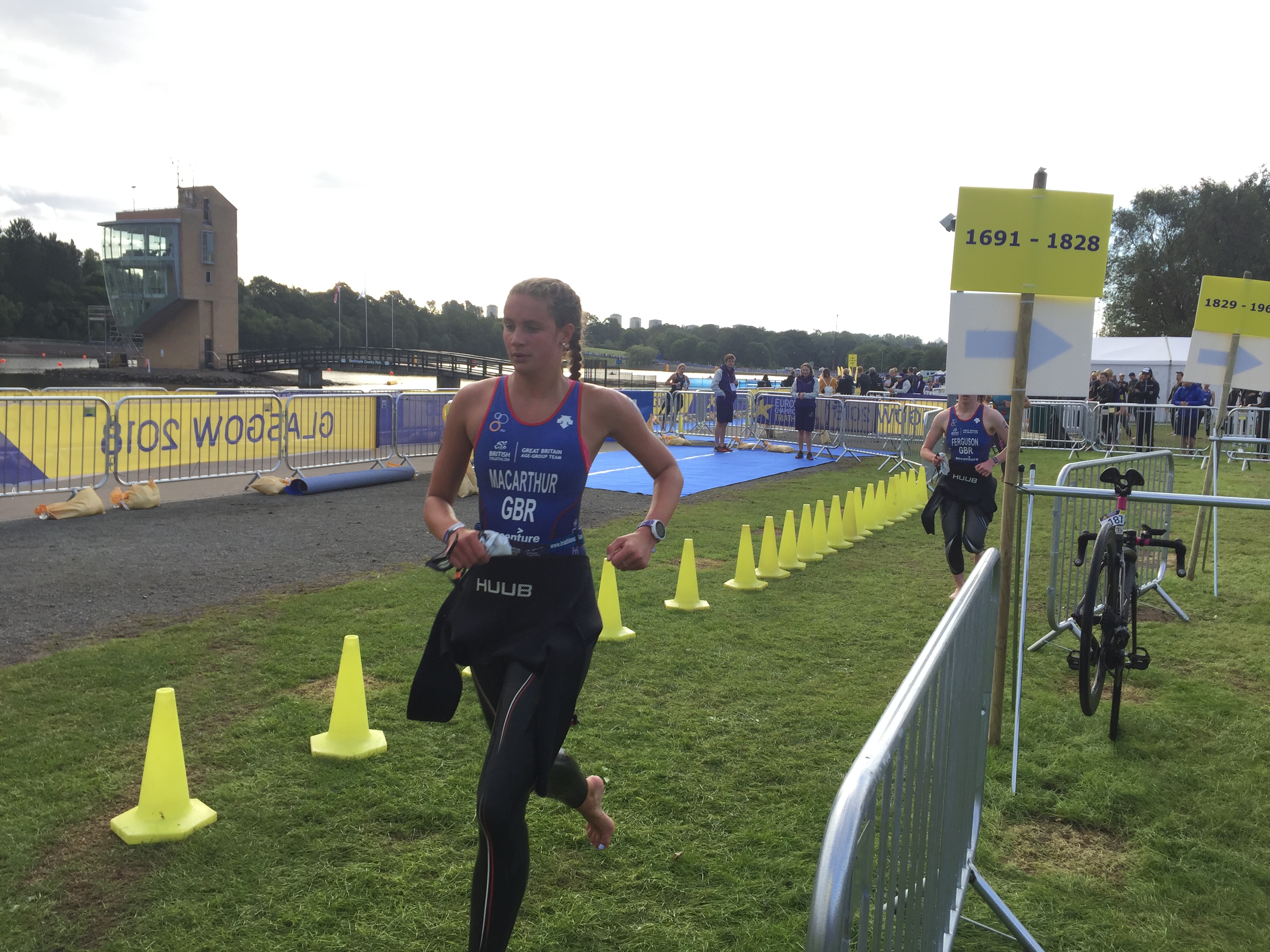 As I dismounted a crowd of people cheered as I ran through to transition for the second time. I quickly threw my bike onto the rack, got my run shoes on, my helmet off and sprinted out and onto the 5km run. My legs felt good at the beginning, running onto the blue carpet and out onto the run by the side of the loch. The run then went out of site of the loch and into the woods. The marshals were all very supportive shouting “go MacArthur!” as i ran past. At first I was confused, how did they know my name? Then i realised it was on my trisuit… At 2.7km into the run I came across a short but steep hill. I powered up it but when I got to the top the lactic acid burned. I knew I had to keep going because there were girls hot on my tail and there was only 2km to go. As i re-entered the far side of the loch I heard over speakers that 3rd place in my age group was coming into the finish line. That motivated me to speed up a bit as I wanted to get to the podium times as close as I possibly could.
